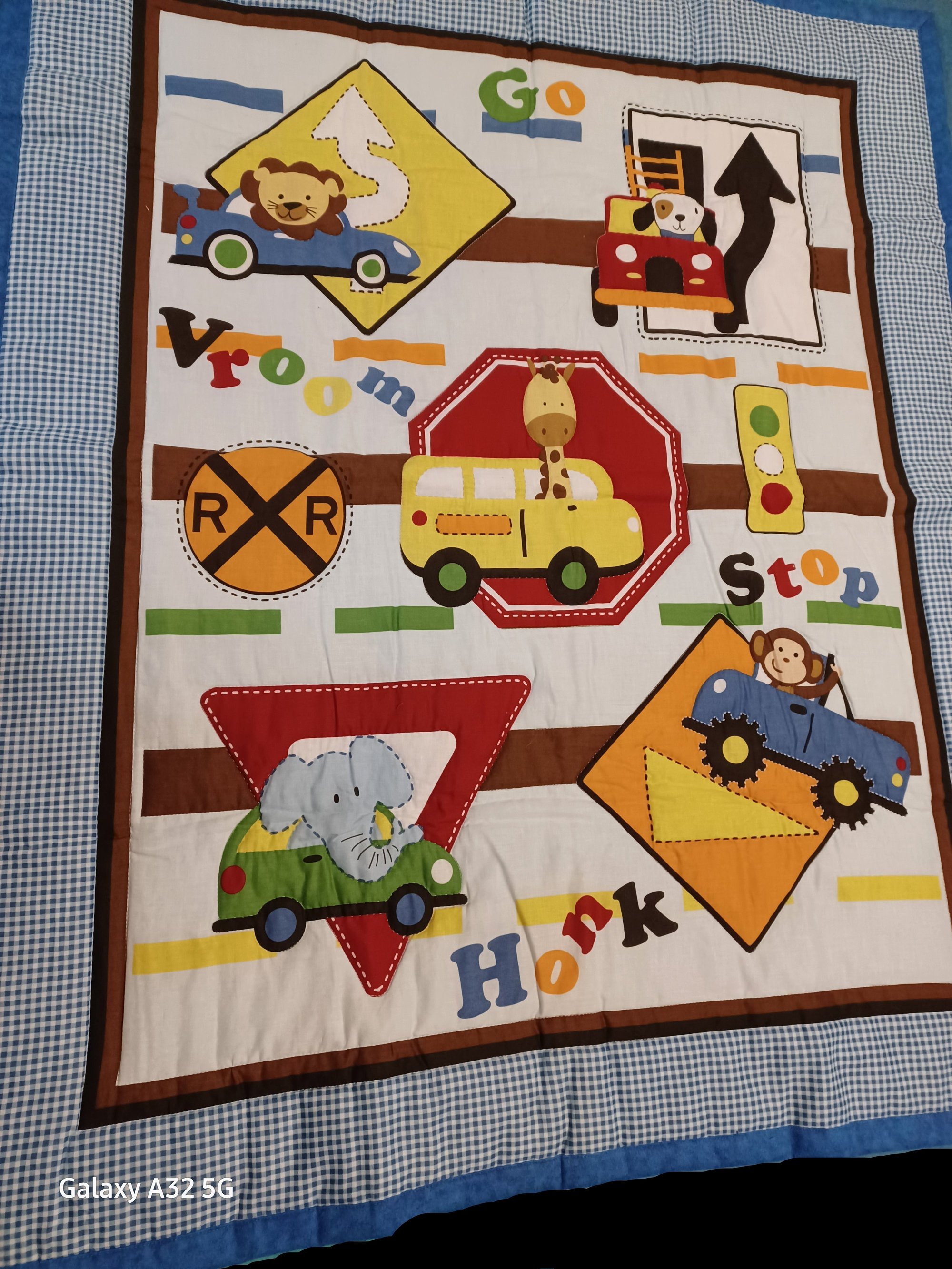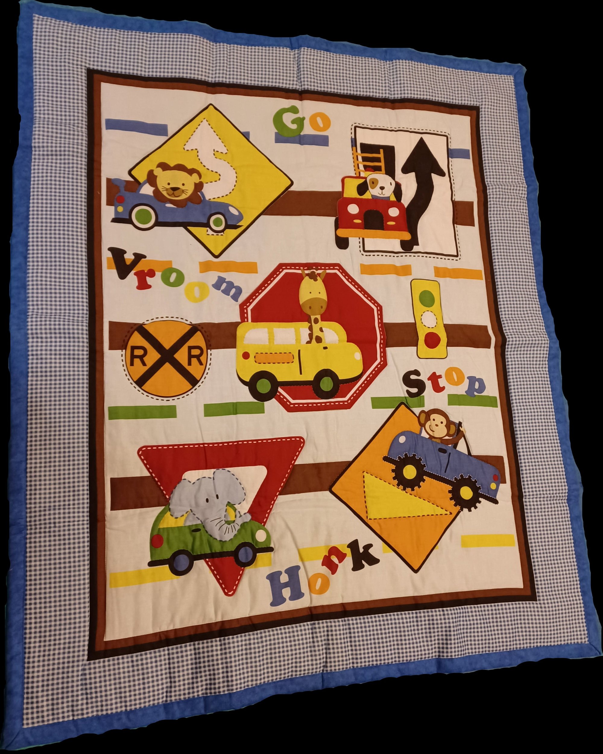 Transform your little one's room with our Baby or Toddler Traffic Signs Animal Quilt! Made of soft and warm cotton & flannel, this quilt features cute animal designs driving in their cars. The perfect size at 43 X 36 will bring a cozy and playful touch to any nursery or toddler's room.