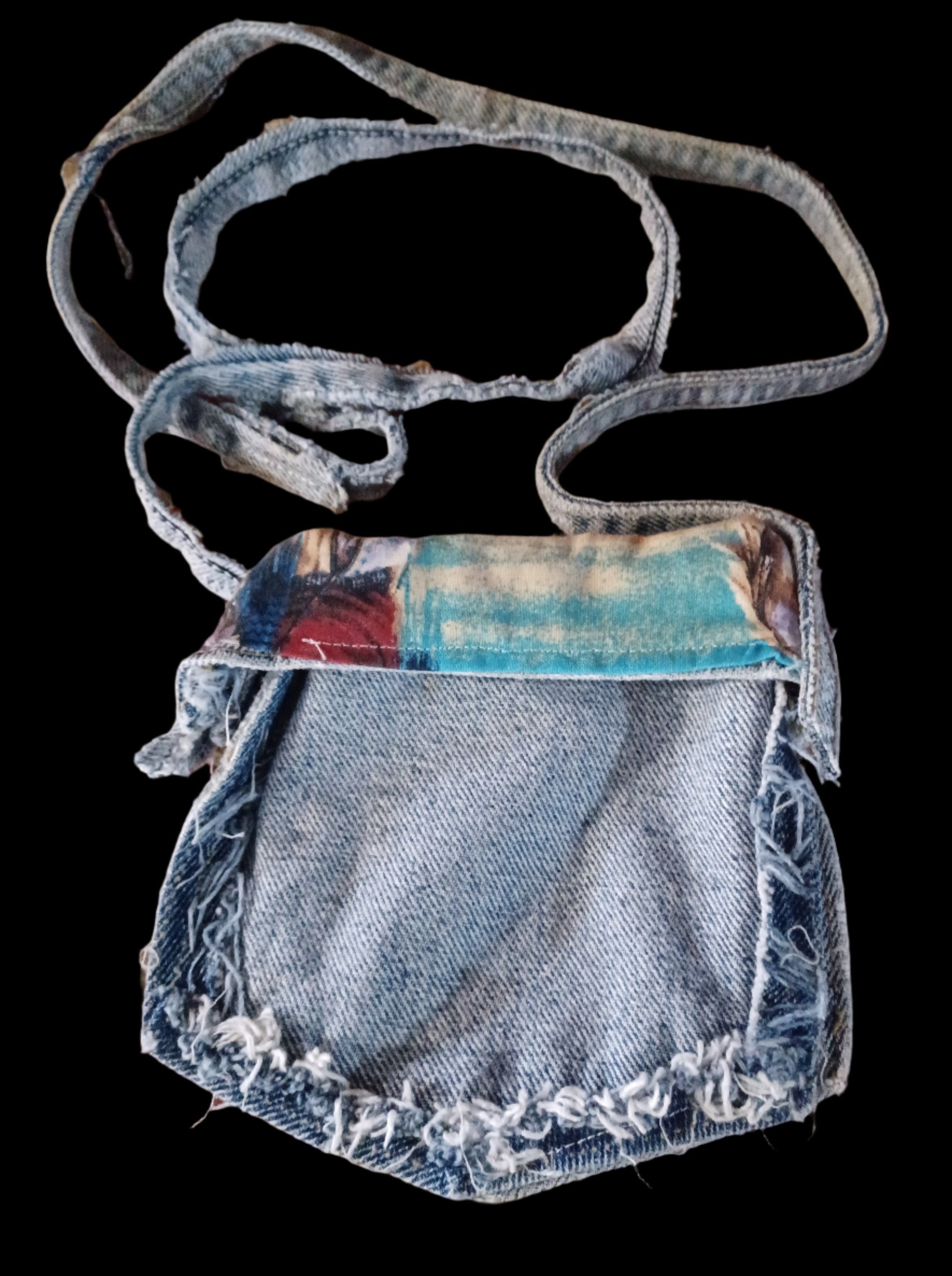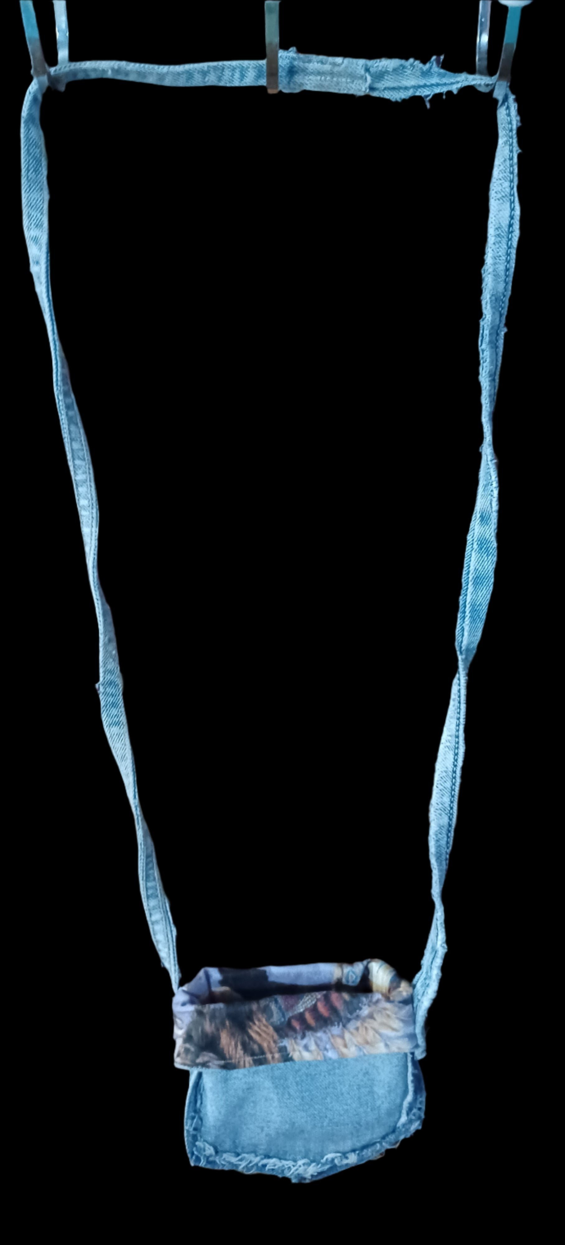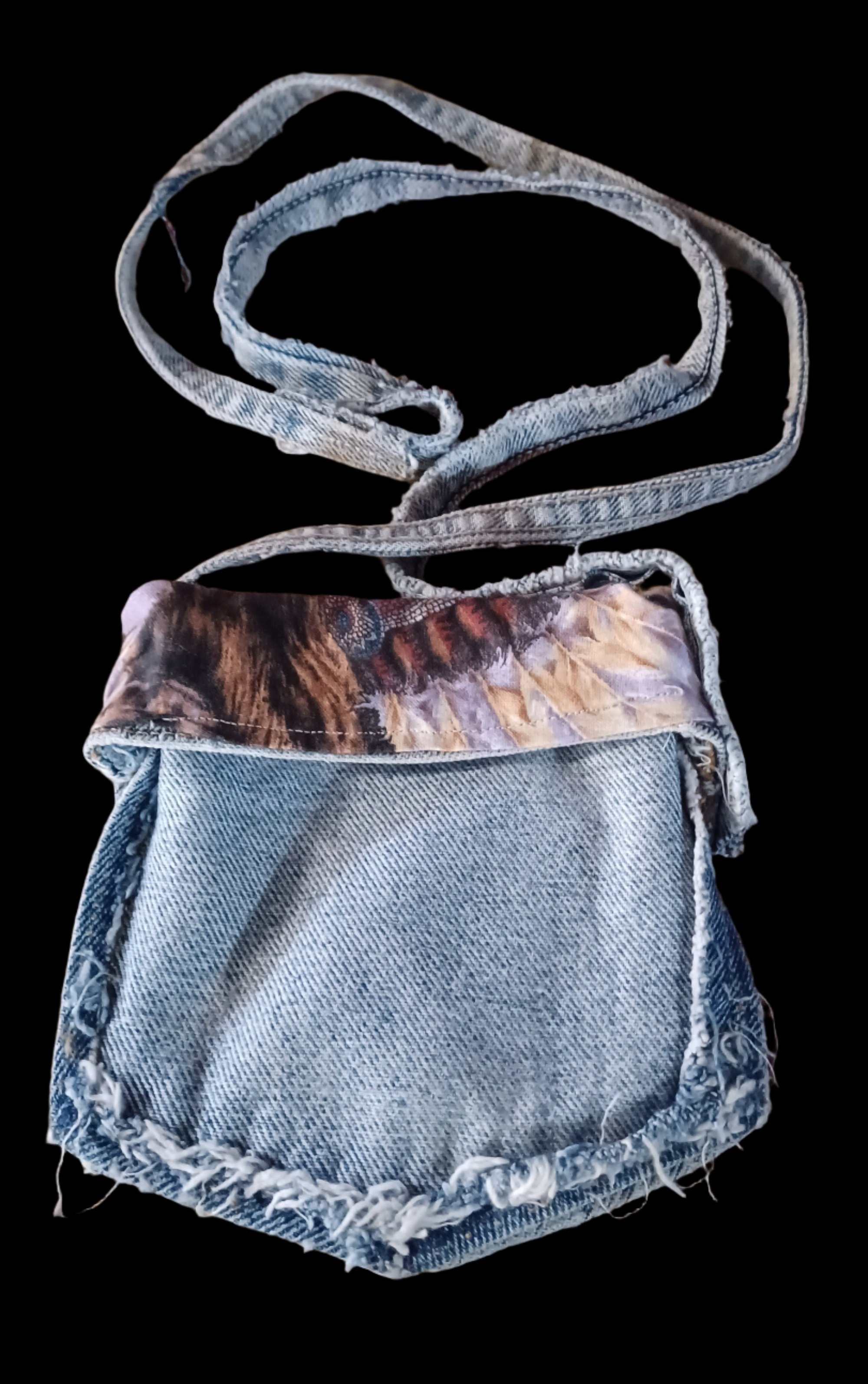 This Blue Jean Pocket Crossbody Bag not only adds style to your outfit with its recycled jean pocket strap, but also offers a lined interior with Native American print fabric. Carry your belongings in an eco-friendly and fashionable way!