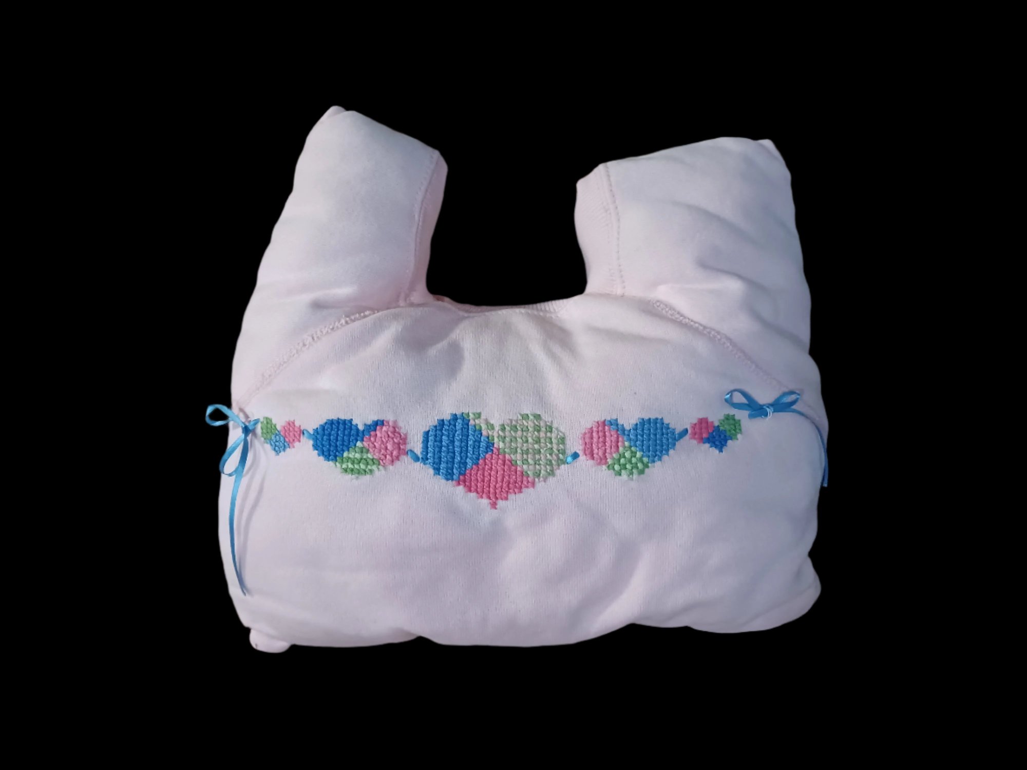 Experience cozy comfort and sustainable style with our Child's Recycled Sweat Shirt Neck Pillow! Made from a recycled pink sweatshirt, this pillow features adorable cross stitch hearts and is stuffed to perfectly fit around a child's neck. Whether on a car ride or relaxing at home, this 14x11x5 pillow will provide unbeatable support and warmth.