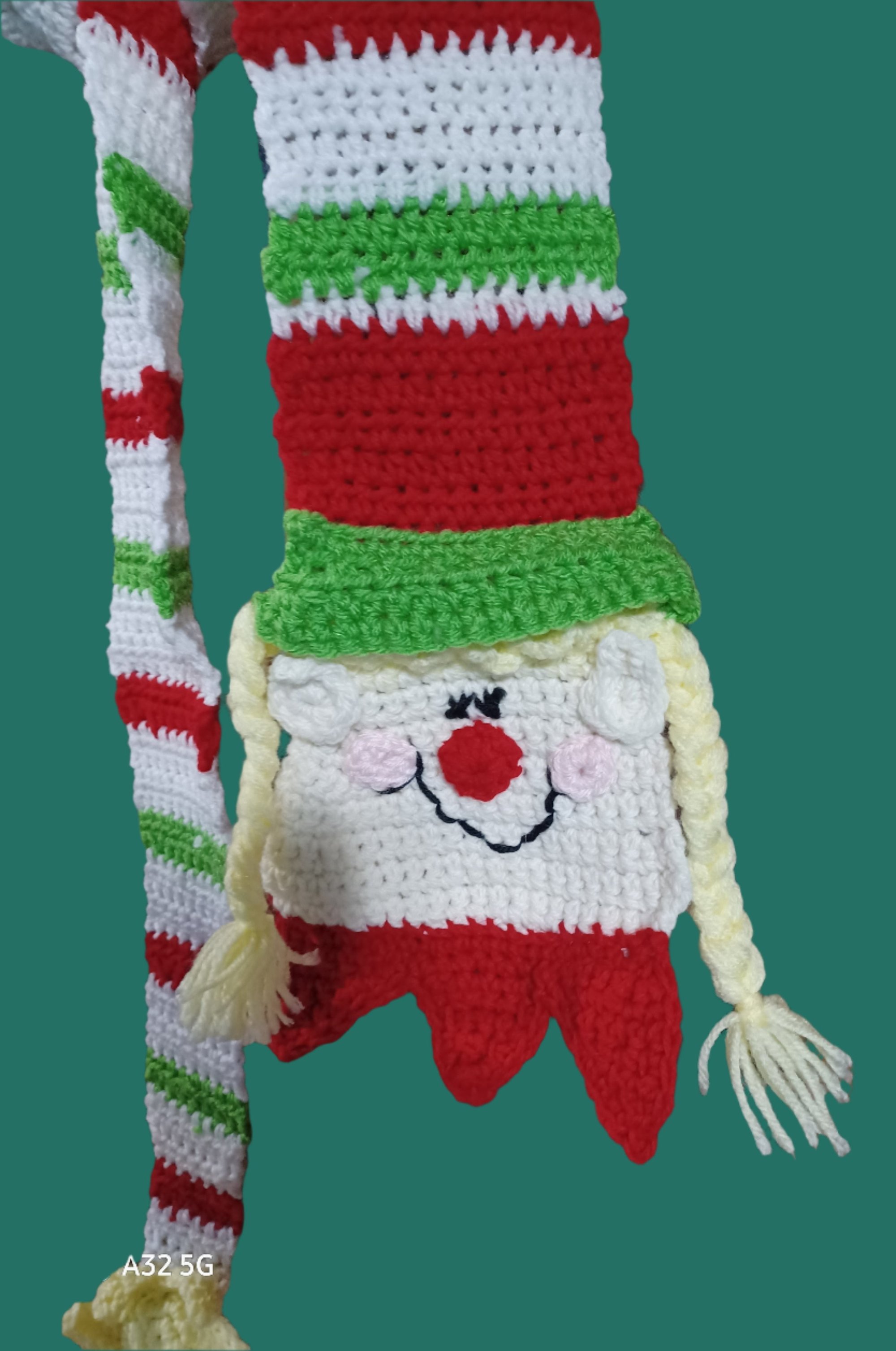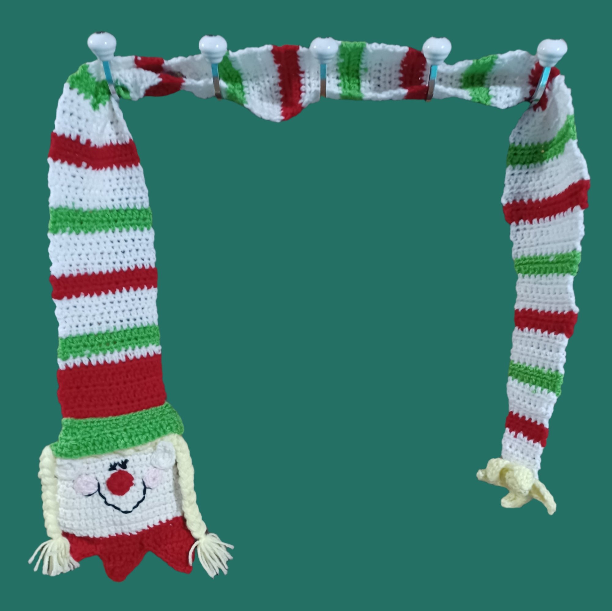 Handmade crochet Elf Face Scarf with a playful 55-inch length and 6-inch width across the face. Features a small keyhole for extra versatility. Perfect for adding a touch of whimsy to your winter wardrobe.