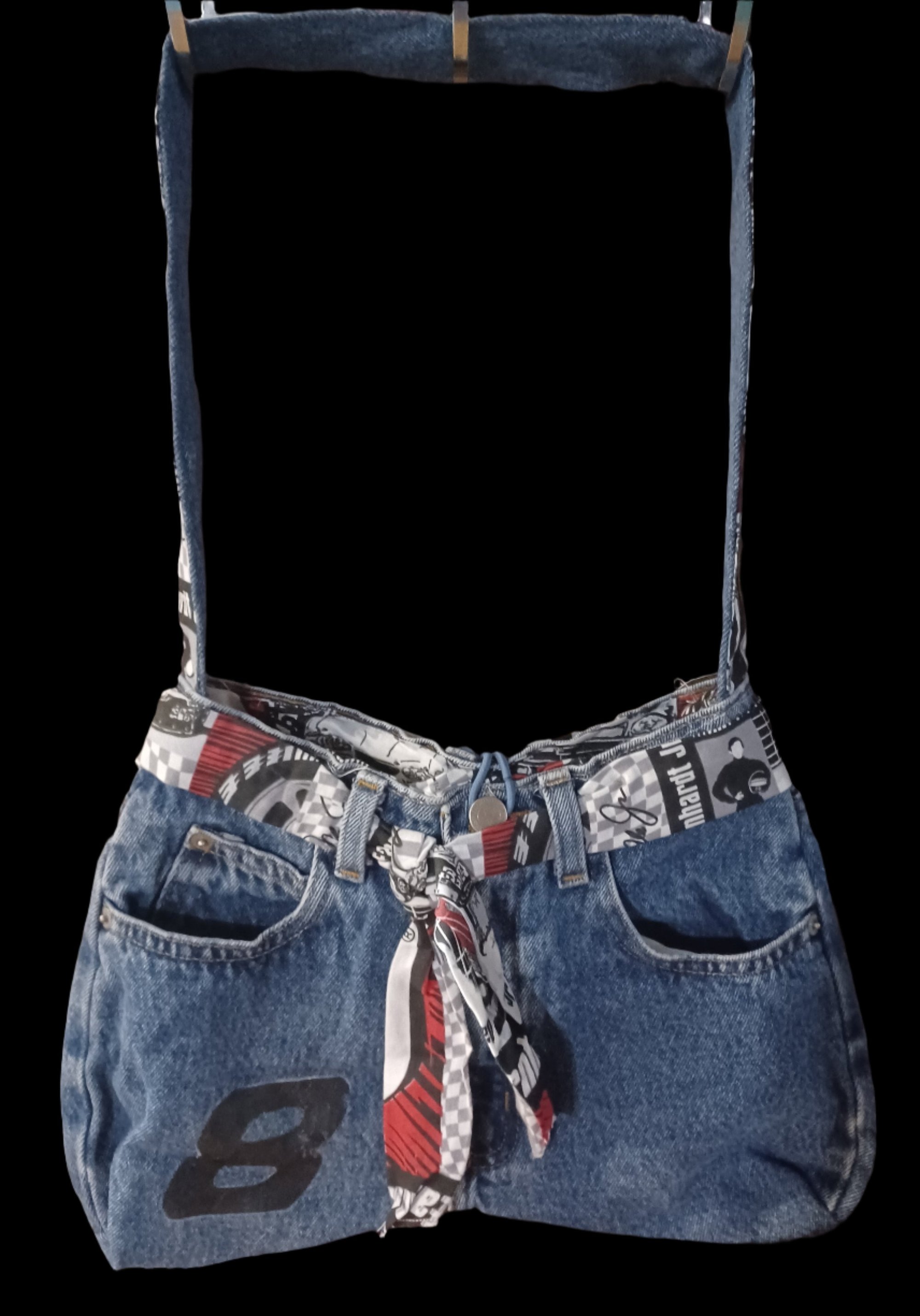Get ready to rev up your style with our Handcrafted Upcycled Nascar Shoulder Bag! This unique bag features a sleek Nascar design, perfect for race day or everyday use. The inside is lined for added durability and all exterior pockets are fully functional for easy access to your essentials. Upgrade your fashion game with this one-of-a-kind bag! 13 X 8 strap drop 14 in