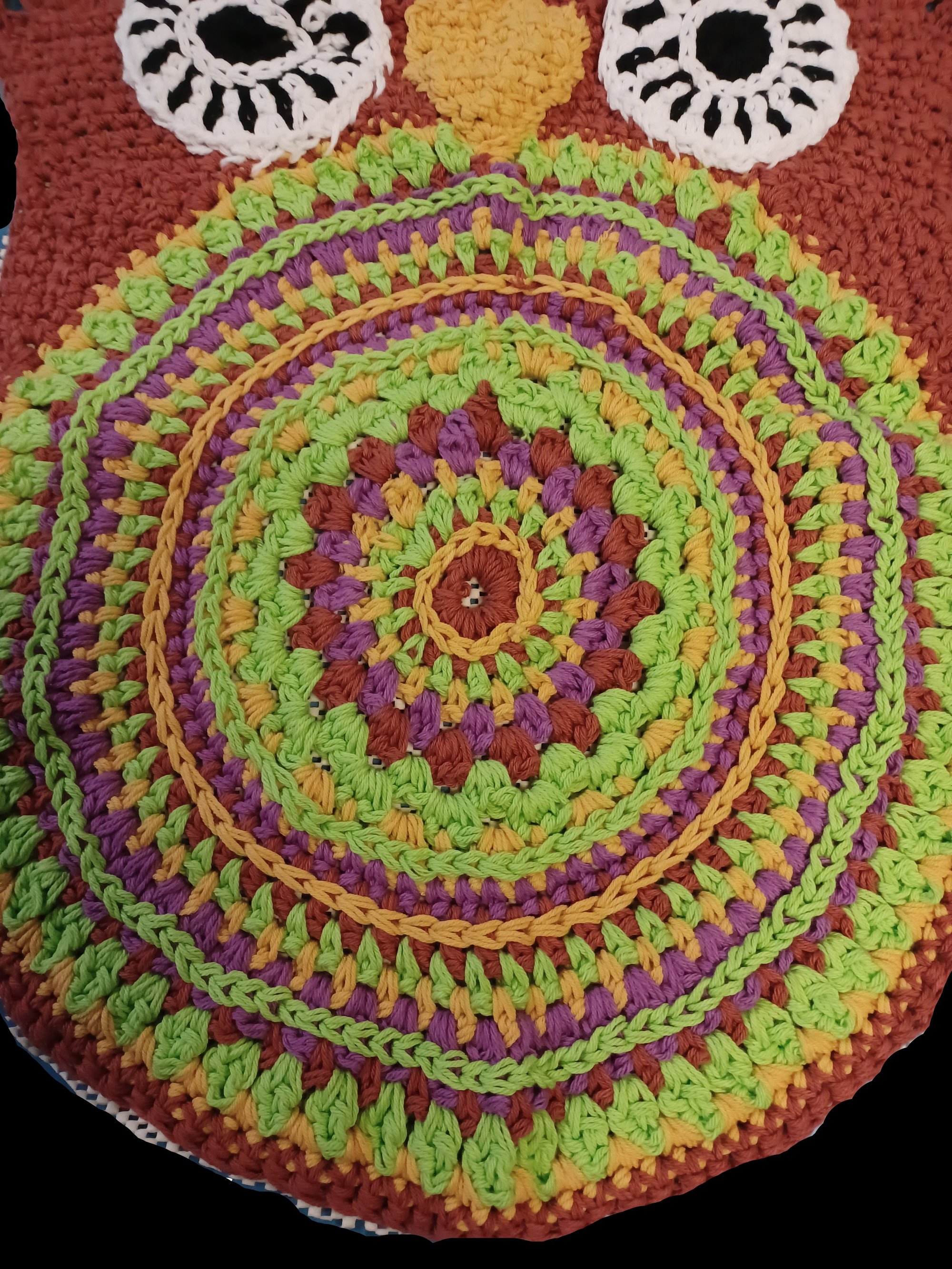 Add a touch of whimsy to your home with this Handmade Crochet Owl Rug! Made with 100% cotton and a non-slip backing, this colorful rug adds charm and functionality to any room. Perfect for adding a playful touch to your living space.