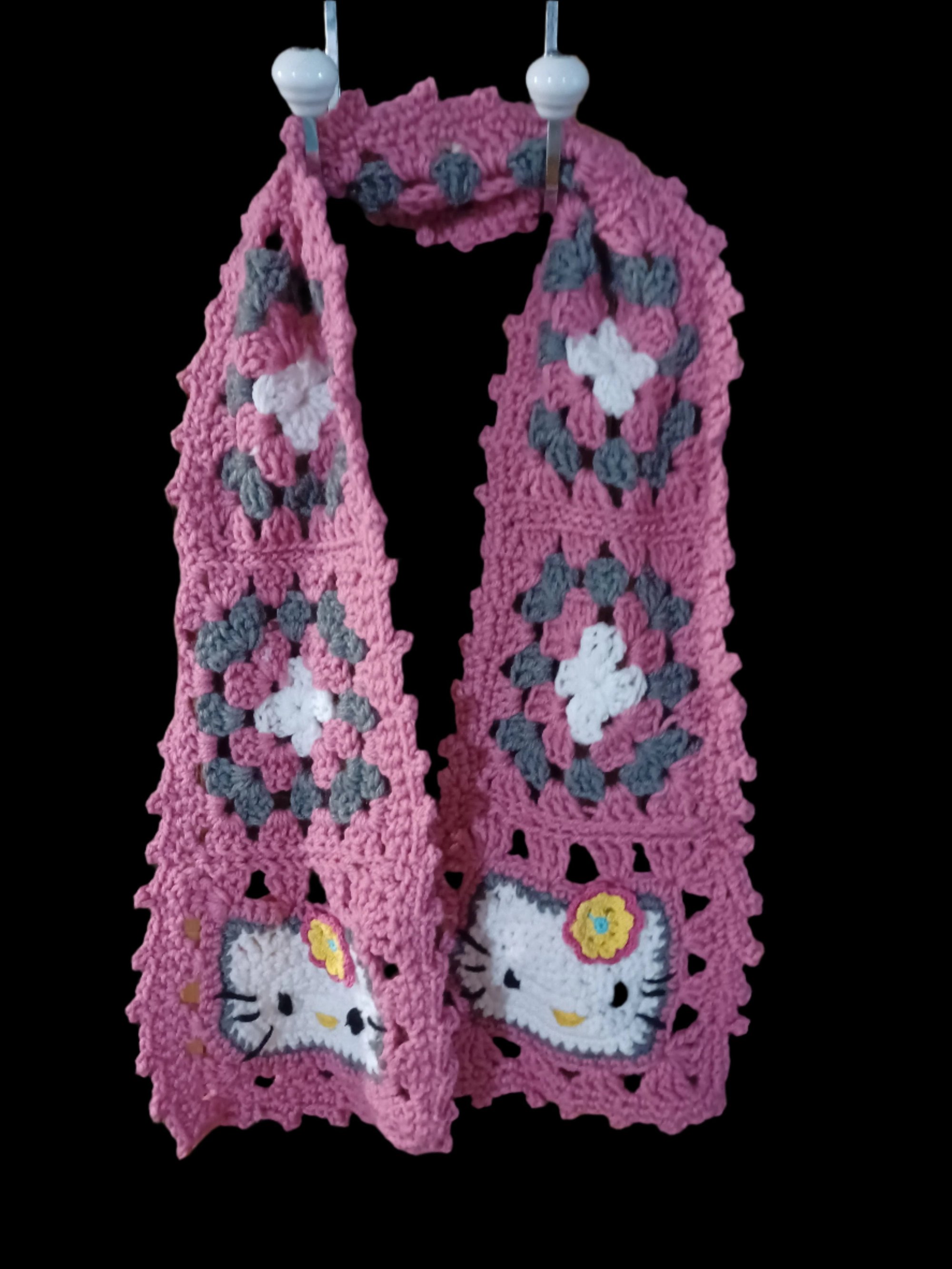 Wrap yourself in cuteness with our Hello Kitty Granny Square Scarf! This extra cute scarf features kitty faces on both sides in a pretty pink and gray color. Stay warm and stylish while showing your love for this iconic feline character. Perfect for any Hello Kitty fan!