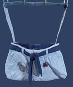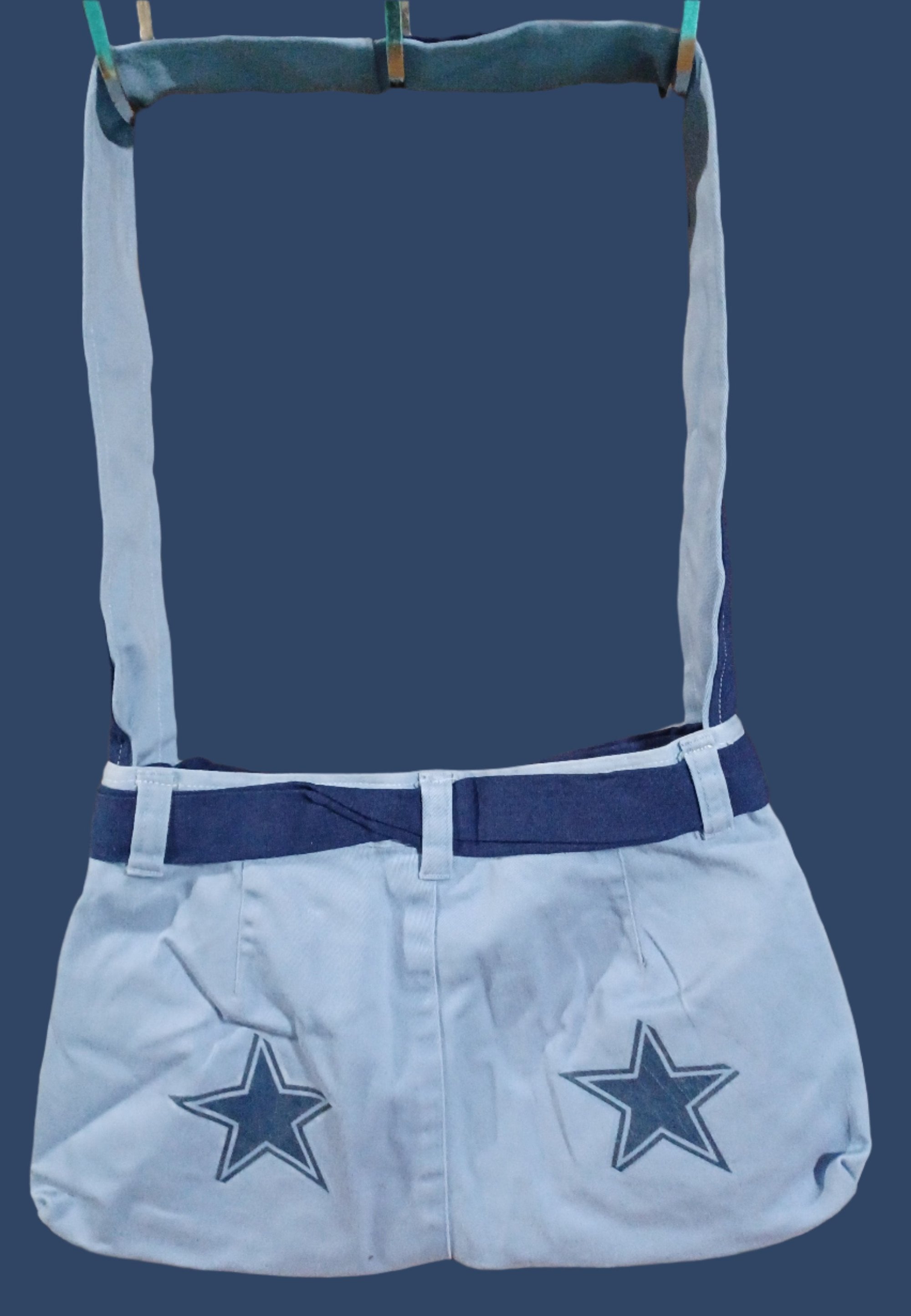 Transform your outfit with the NFL Cowboys Remade Jean Shoulder Bag! Not only does this bag feature a removable belt and unique iron on decals, but it also has usable outside pockets and a secret spot inside the zipper for all your essentials. Plus, it's machine washable for easy maintenance. Size 13 X 8 and Strap drop at 14 in for comfortable wearing. Upgrade your style today!