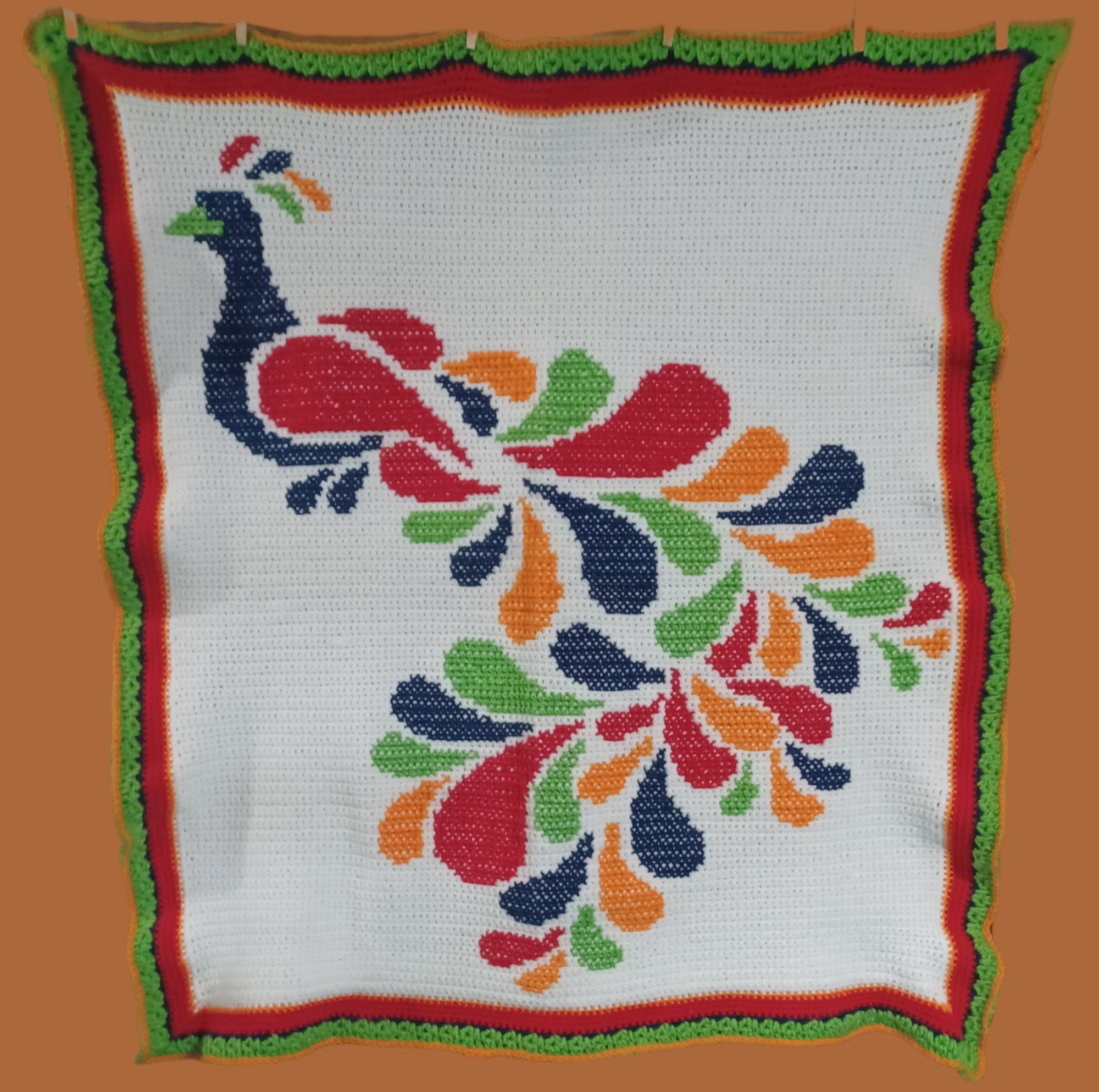 Unleash a burst of color and warmth with our Perfect Peacock Throw Blanket. Crafted with a combination of crochet and cross stitch techniques, this 41 X 38 blanket showcases a stunning peacock design. Add a touch of beauty and comfort to any room in your home!