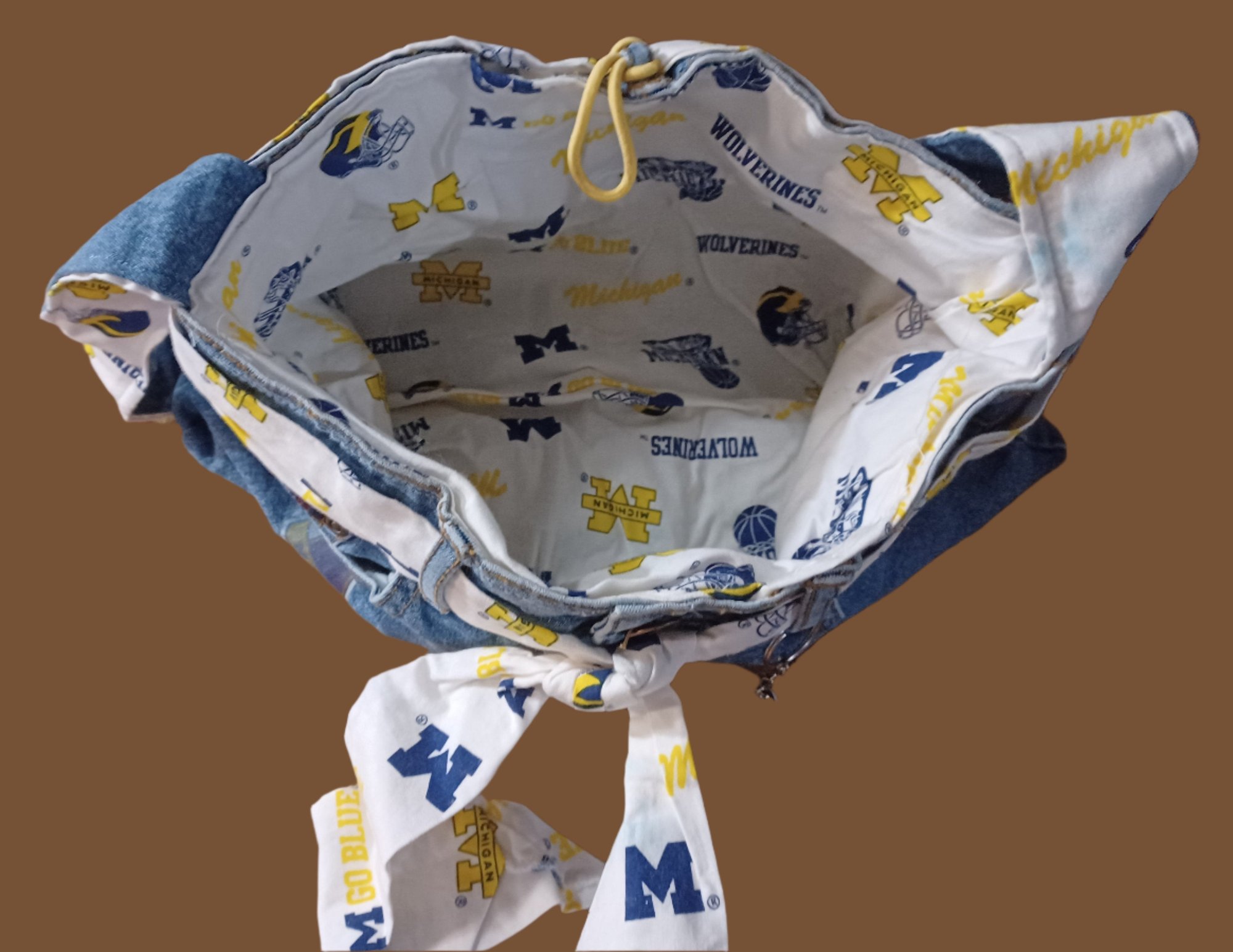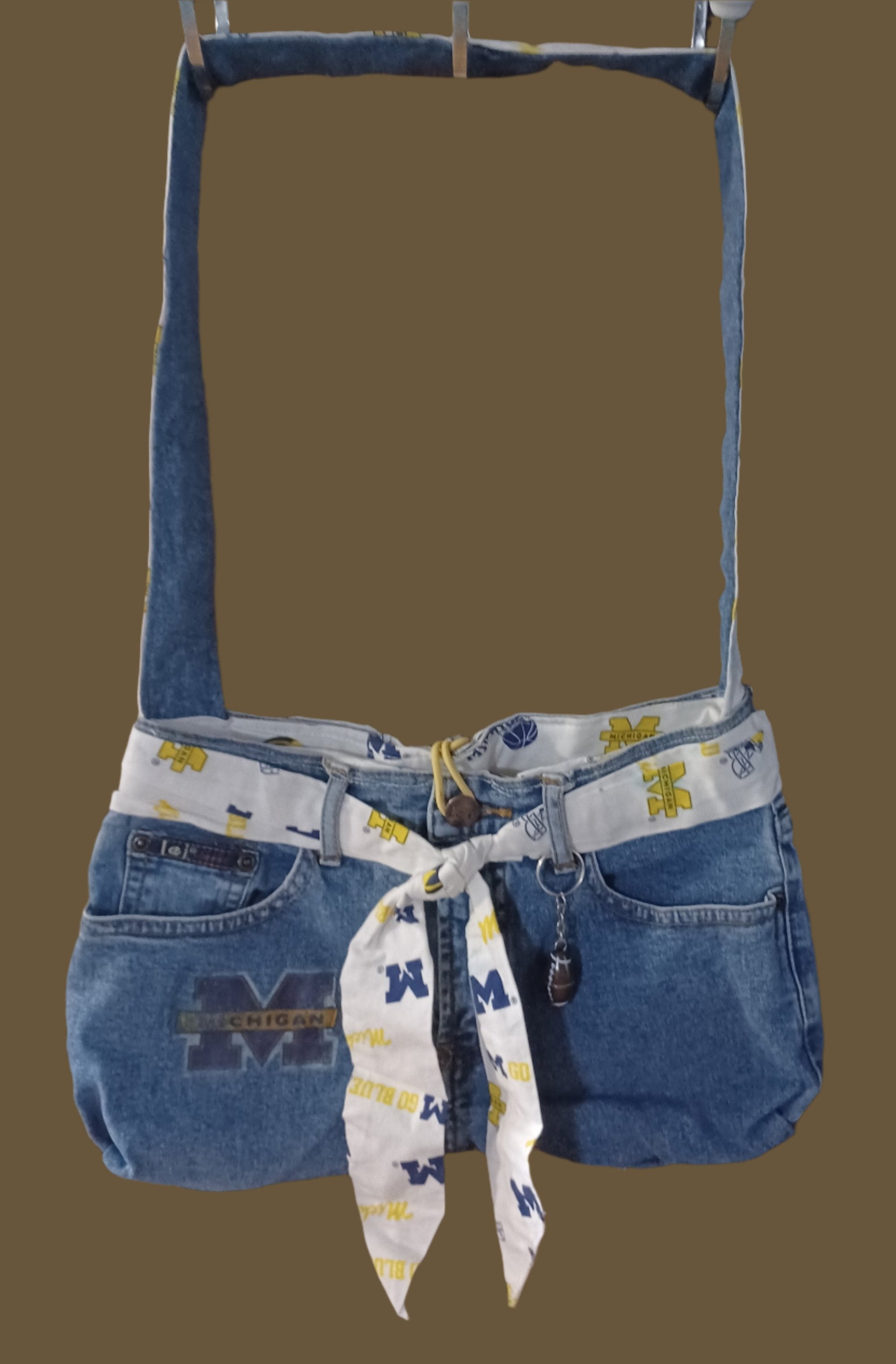 Embrace your team spirit with the Re-created Jean Purse Michigan Football Theme! Made from upcycled blue jeans, this purse features a unique sports team fabric and usable pockets for convenience. Measuring 14 X 8 with a 15 inch strap drop, it's perfect for game day. Please note: due to the use of recycled materials, each purse may have minor imperfections, adding to its character and charm.