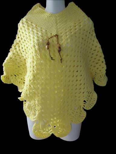 Stay cozy and stylish with our handmade poncho. This poncho is quick and easy to slip on and off, like a hands-free blanket. The scalloped edge design will add a little flair to your outfit. One size fits most. 26 Length X 27 Wide, tie & beads are removable.